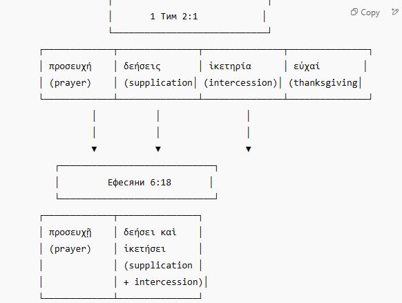 | Концепция | 1 Тимотей 2:1 (гръцки) | Транслитерация | Буквално значение | Ефесяни 6:18 (гръцки) | Транслитерация | Буквално значение |