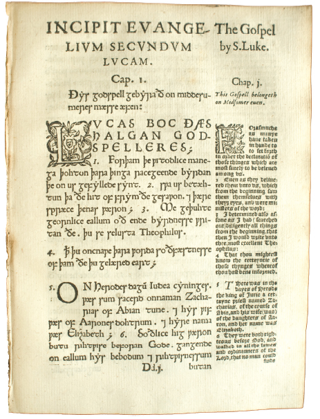 Преданието разказва, че още монасите на абатството Тивосток в Девоншайър притежавали печатен шрифт с който отпечатвали англосаксонските текстове. За съжаление това което е достигнало до нас са най-вече печатните колажи на небезизвестния Матю Паркър (1504-1575), архиепископ на Кентърбъри. От своята позиция на женен свещеник, Паркър издава богослужебна литература целейки да защити богословските позиции на Англиканската църква и правото на свещениците на женитба, въпреки че самата кралица Елизабет била против последната практика. Ето защо между коалираните от него издания могат да бъдат открити разнообразни текстови източници от Свидетелство на античността на Джон Дей, Archaionomia, sive De priscis Anglorum legibus libri на Лаурънс Ноуел, Historiæ ecclesiasticæ gentis Anglorum libri на Биде до отпечатаната отново от Джон Дей западно-саксонска версия на Евангелията.